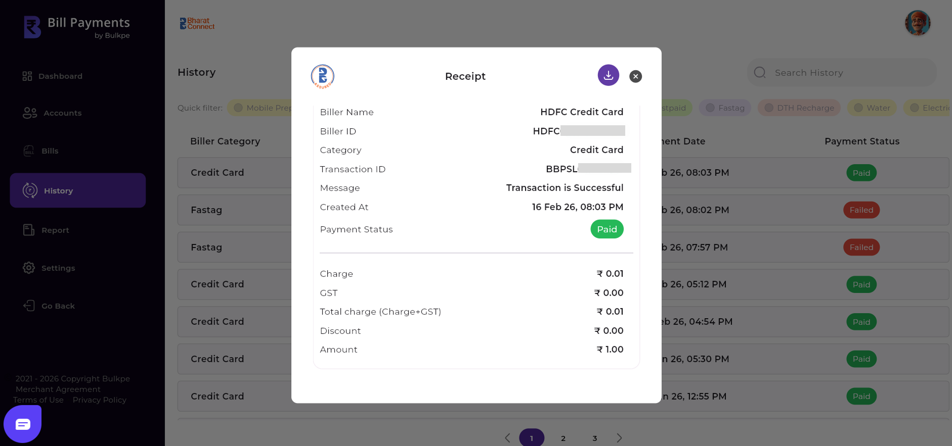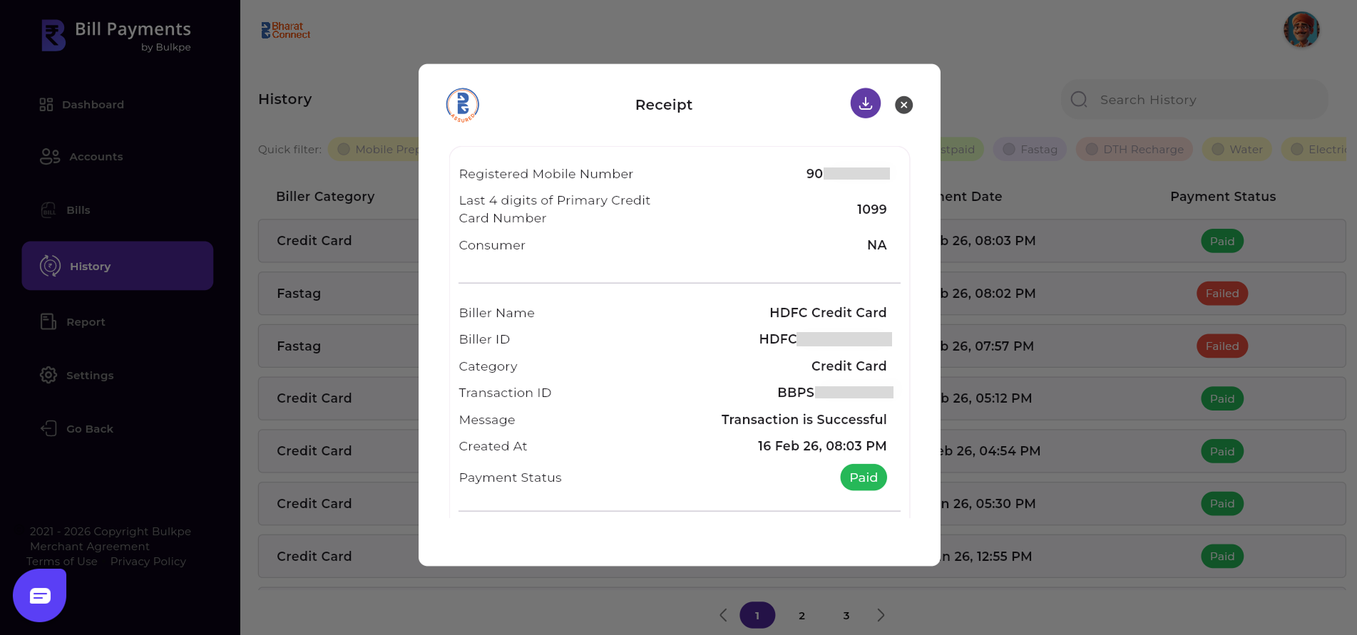 The History section serves as your single, reliable place to track all bill payments made through Bulkpe. Once a payment is completed, you are automatically redirected here to view a comprehensive summary of the transaction, including the bill payment status, payment amount, applicable charges, bill payment category, transaction ID, biller name, biller ID and a message describing reason for failure or pending state of a transaction -ensuring complete transparency and easy reference whenever needed.