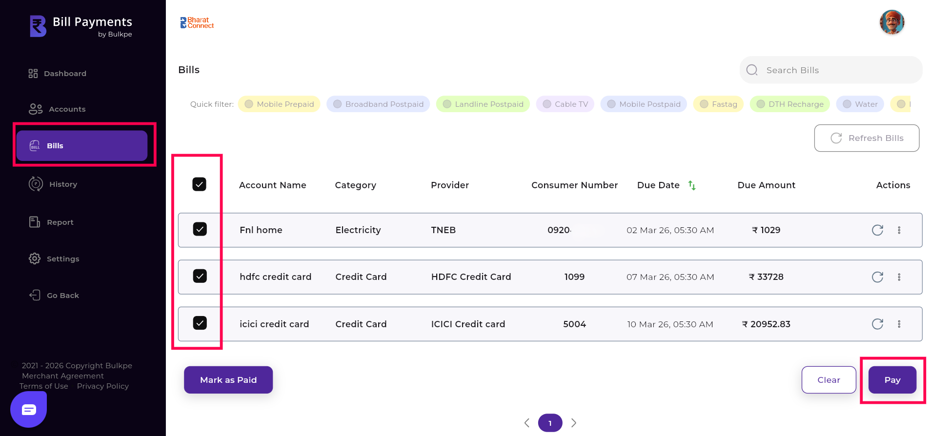 After marking the required bills, the user must click the “Pay” button located at the bottom right to proceed with the payment.