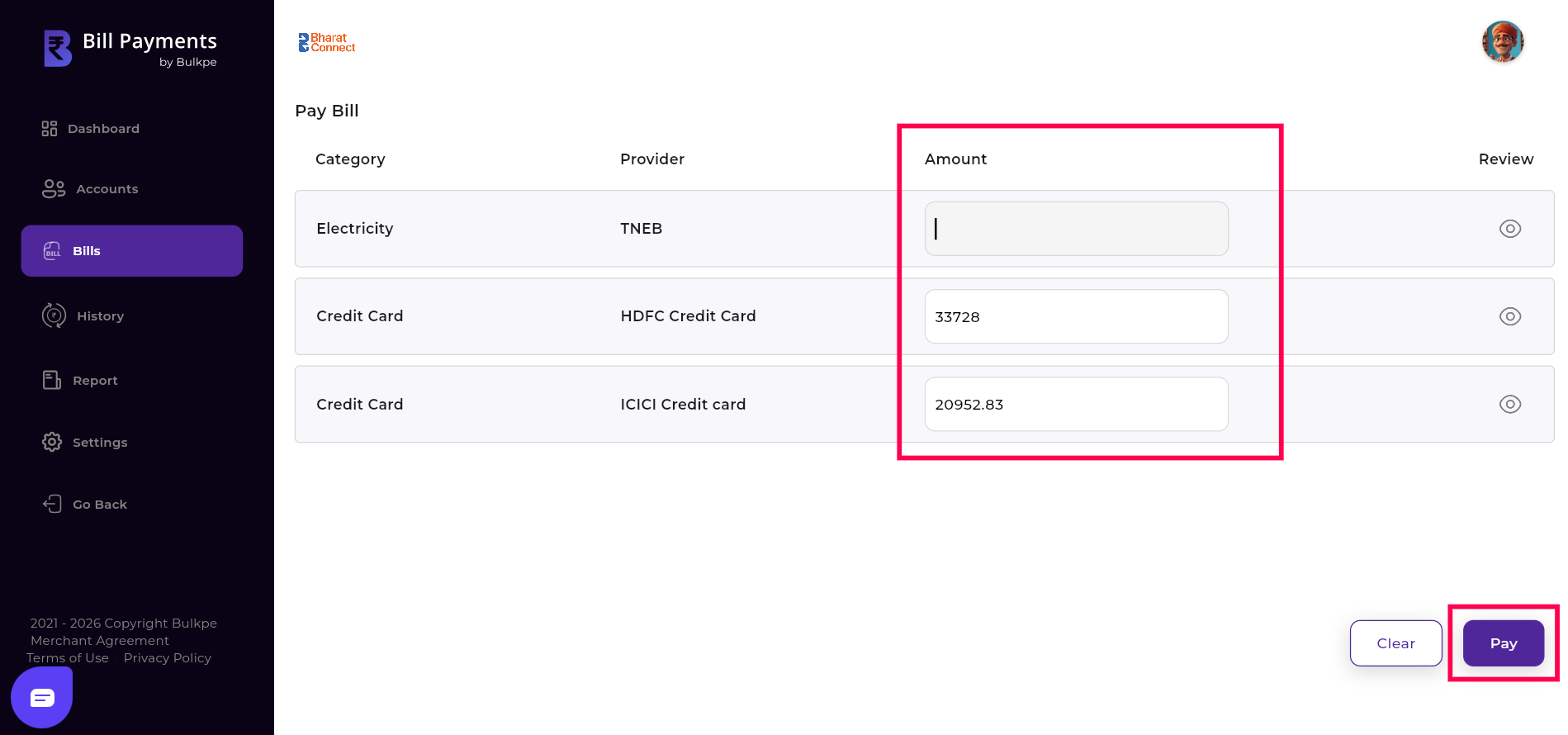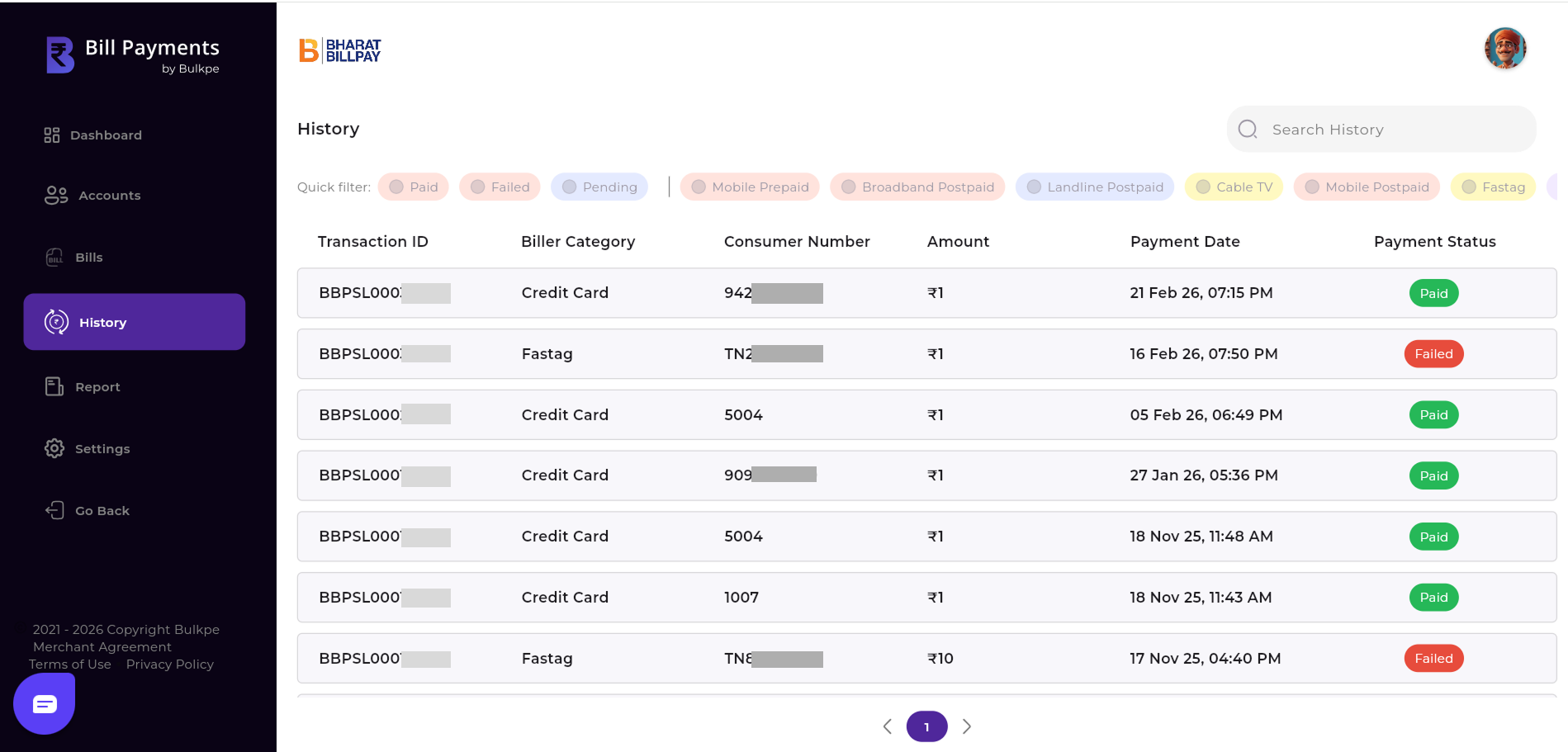 After the amount is selected or entered manually, the user must click the “Pay” button at the bottom right to proceed. Upon clicking, the bill amount is deducted from the Bulkpe virtual account, subject to balance availability. The user is then redirected to the History tab, where they can view the status and detailed information of all bill paid.